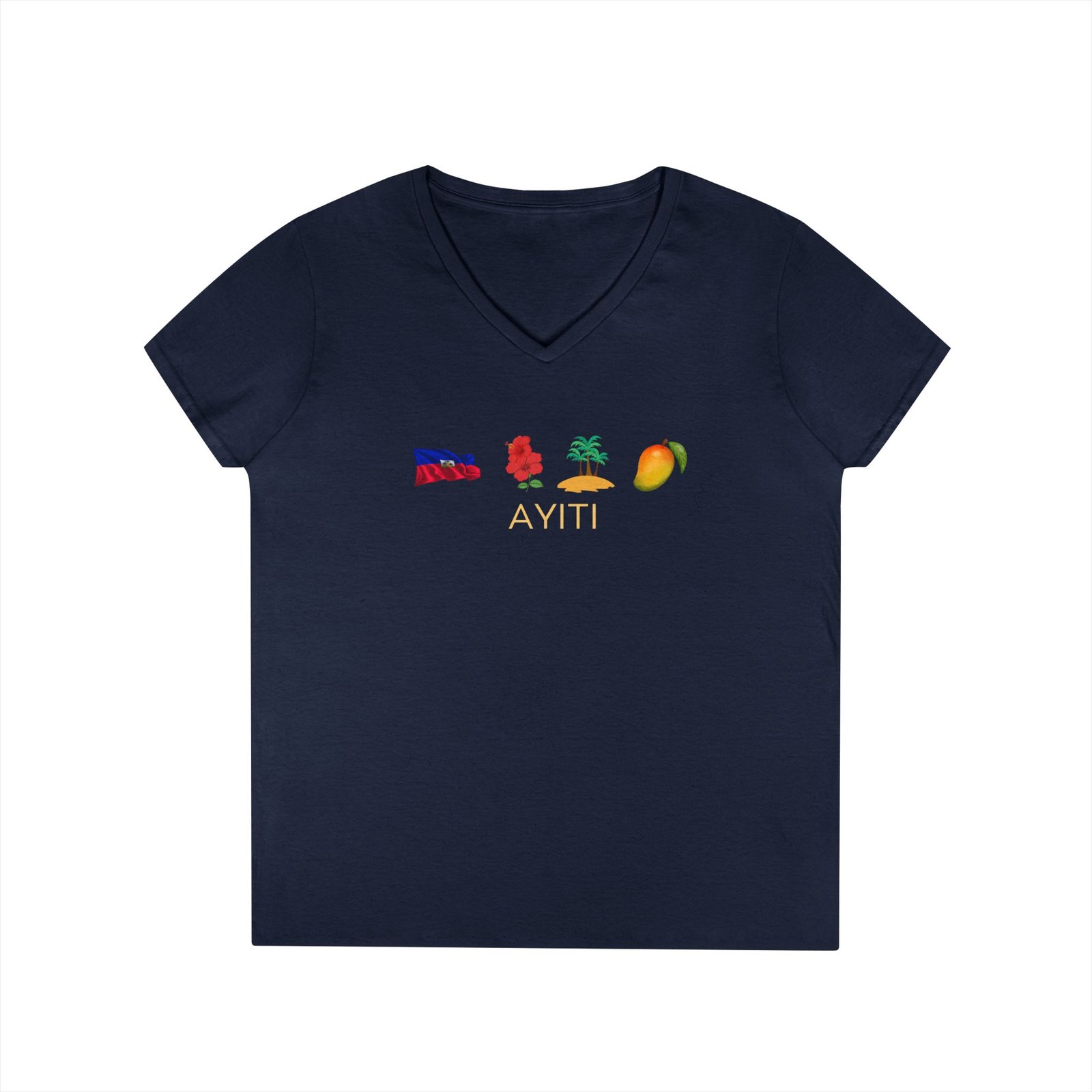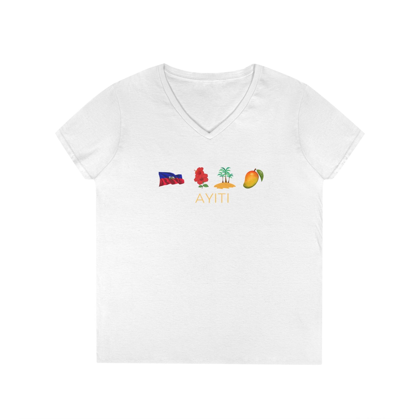 Lightweight and relaxed, this V-neck celebrates island roots with a row of small, colorful icons across the chest — flag, map, palm, and mango — and the island name tucked beneath. The soft, breathable cotton drapes gently in a semi-fitted cut that moves with you. Wear it on warm mornings watching the harbor, at weekend markets, or layered under a light jacket for cooler evenings. The clean white canvas keeps the artwork crisp and wearable, while the tear-away label and reinforced seams make it comfortable long after the first wear.